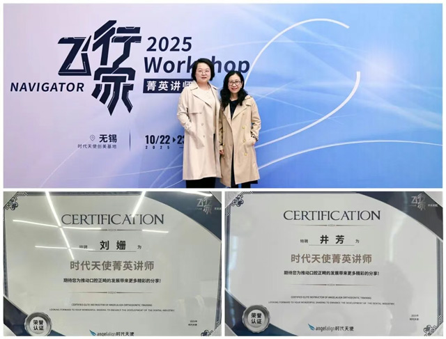 10月22日至23日,由隐形正畸民族品牌时代天使主办的“2025飞行家菁英讲师Workshop”在江苏无锡举行。新桥口腔业务院长、正畸专科首席医生刘姗与正畸专家井芳受邀参会,并双双获评为“时代天使菁英讲师”。