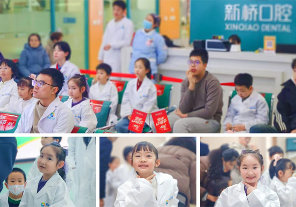 “职业大变身”是最受孩子们欢迎的环节,大家换上新桥口腔定制的迷你白大褂,化身“小小牙医”。在医护人员的耐心指导和全程护航下,手持专业口镜,小心翼翼地为同伴们进行口腔检查,并模仿牙医的语气询问“牙齿有没有不舒服”。