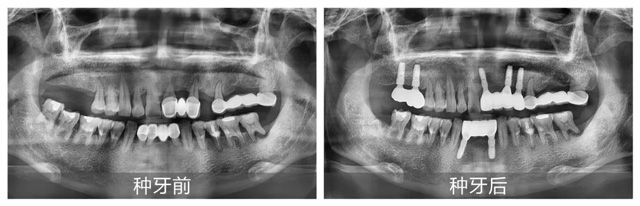 经CBCT全景检查所见,谢海洋主任发现卞先生存在多颗牙缺失、残存牙体伴有严重骨吸收,且多颗修复体失效等问题,亟待通过种植牙重建咬合功能。针对顾客异地就医、就诊时间有限的情况,谢海洋主任为卞先生制定了“上下颌多颗即拔即种+连冠修复”的个性化种植方案:下颌种植2颗基牙支撑2颗连冠,上颌右侧种植2颗独立基牙,上颌前侧种植3颗基牙连冠修复1颗。